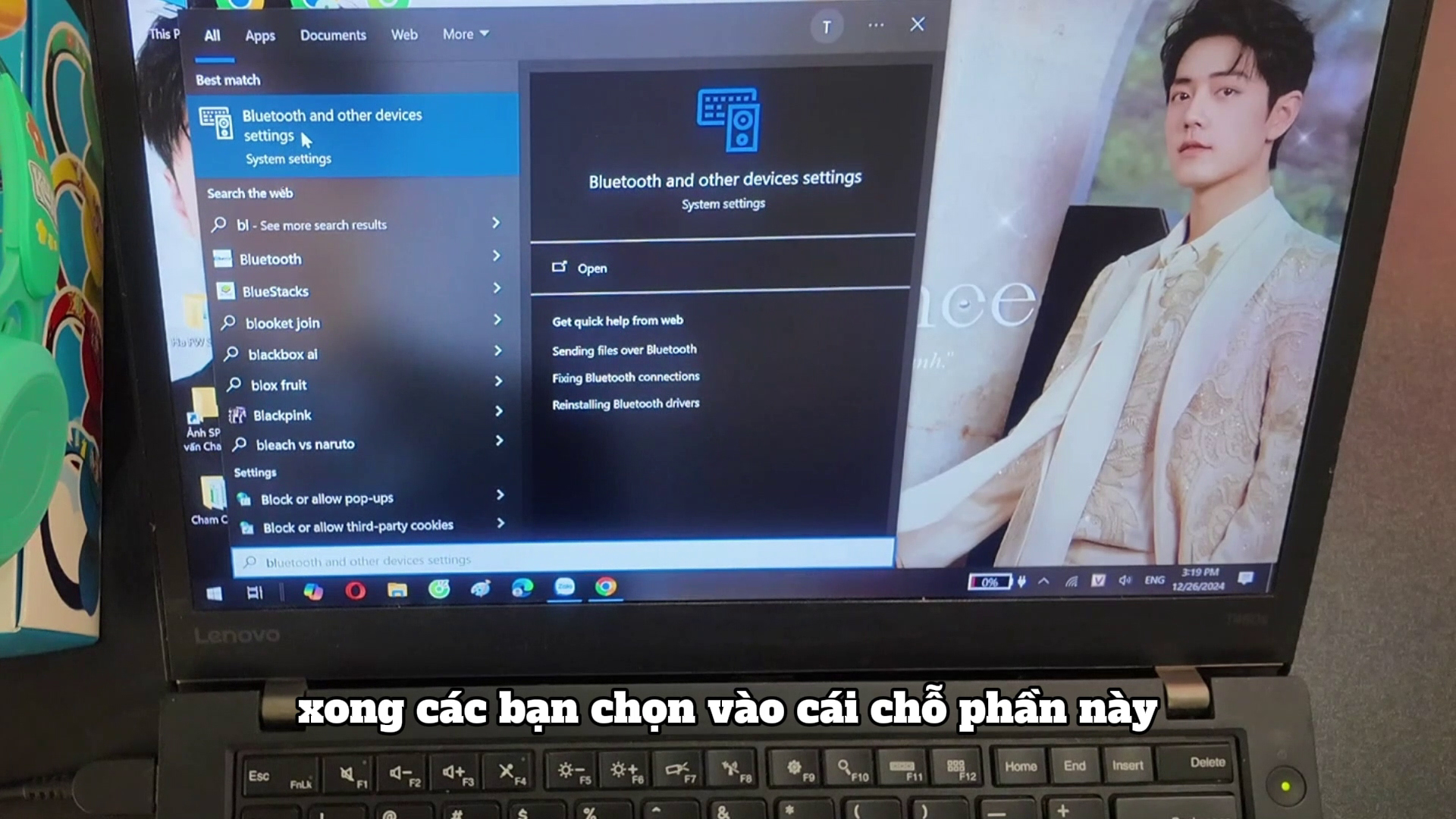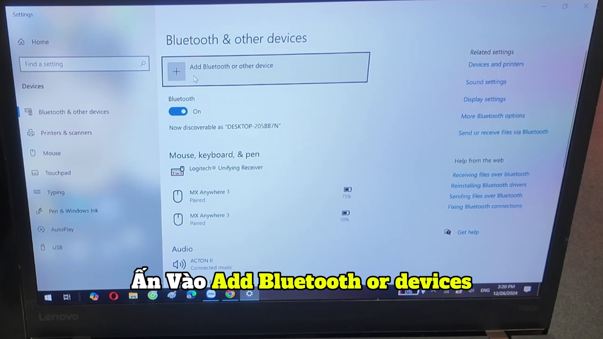 - Với máy tính nhấn vào phím Windown rồi gõ: "Bluetooth and other devices setting" mở cài đặt Bluetooth trên thiết bị như hình. Sau đó tìm và chọn tên thiết bị "Tai nghe Kun Đa Chiều", nhấn vào để kết nối.