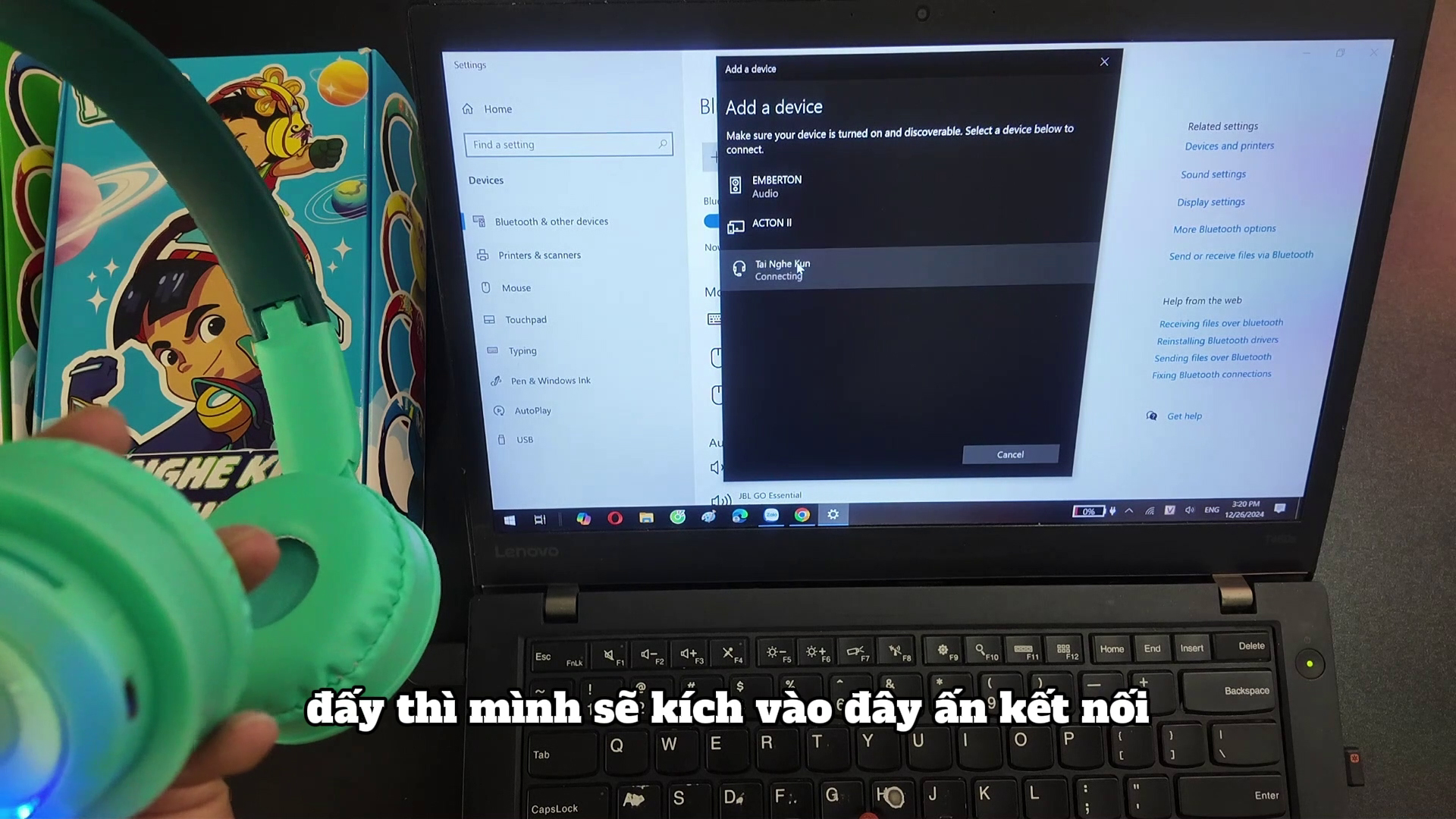 Đợi máy tính tìm tai nghe blueooth và bấm vào để kết nối.
