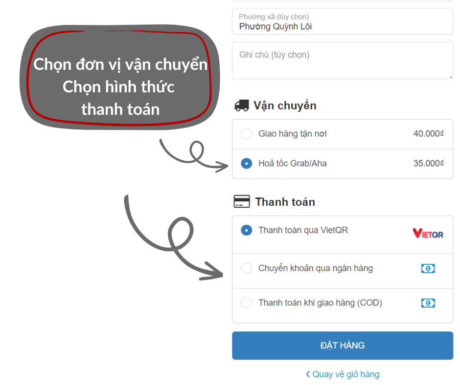 Bước 4: Chọn đơn vị vận chuyển và hình thức thanh toán