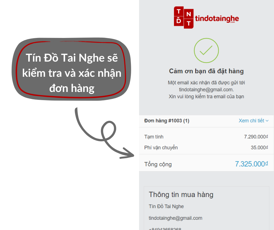 Sẽ có email gửi để xác nhận đơn hàng, Tín Đồ Tai Nghe cũng sẽ kiểm tra lại thông tin và xác nhận đơn hàng của quý khách.