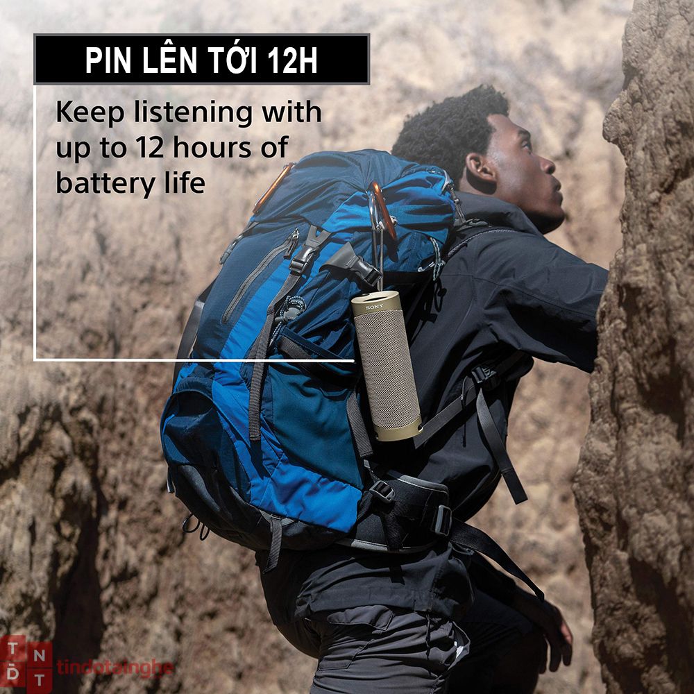 SRS-XB23 của Sony được trang bị một viên pin Lithium-ion dung lượng 2600mAh, cho phép sử dụng liên tục lên đến 12 giờ với âm lượng trung bình. Điều này giúp người dùng có thể tha hồ thưởng thức âm nhạc yêu thích trong suốt cả ngày mà không cần lo lắng về việc sạc lại pin. Ngay cả khi bật chế độ Extra Bass, loa cũng sẽ duy trì thơi gian hơn 10 tiếng chơi nhạc.