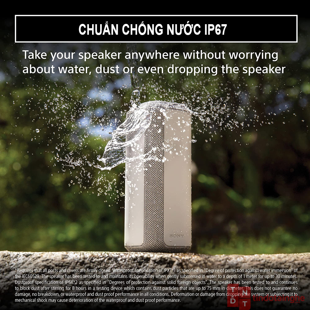Loa di động Sony SRS-XE300 mang đến tính năng chống nước và chống bụi ấn tượng, giúp bạn yên tâm sử dụng mà không cần lo ngại vấn đề ẩm ướt hay bụi bẩn. Nhờ chuẩn chống nước IP67, loa có khả năng chịu được nước mặn, cho phép bạn thoải mái đem theo khi đi tới bãi biển hay hồ bơi. Bên cạnh đó, thiết kế kín giúp loa ngăn chặn bụi hiệu quả, đảm bảo không gây ảnh hưởng đến bên trong thiết bị.
