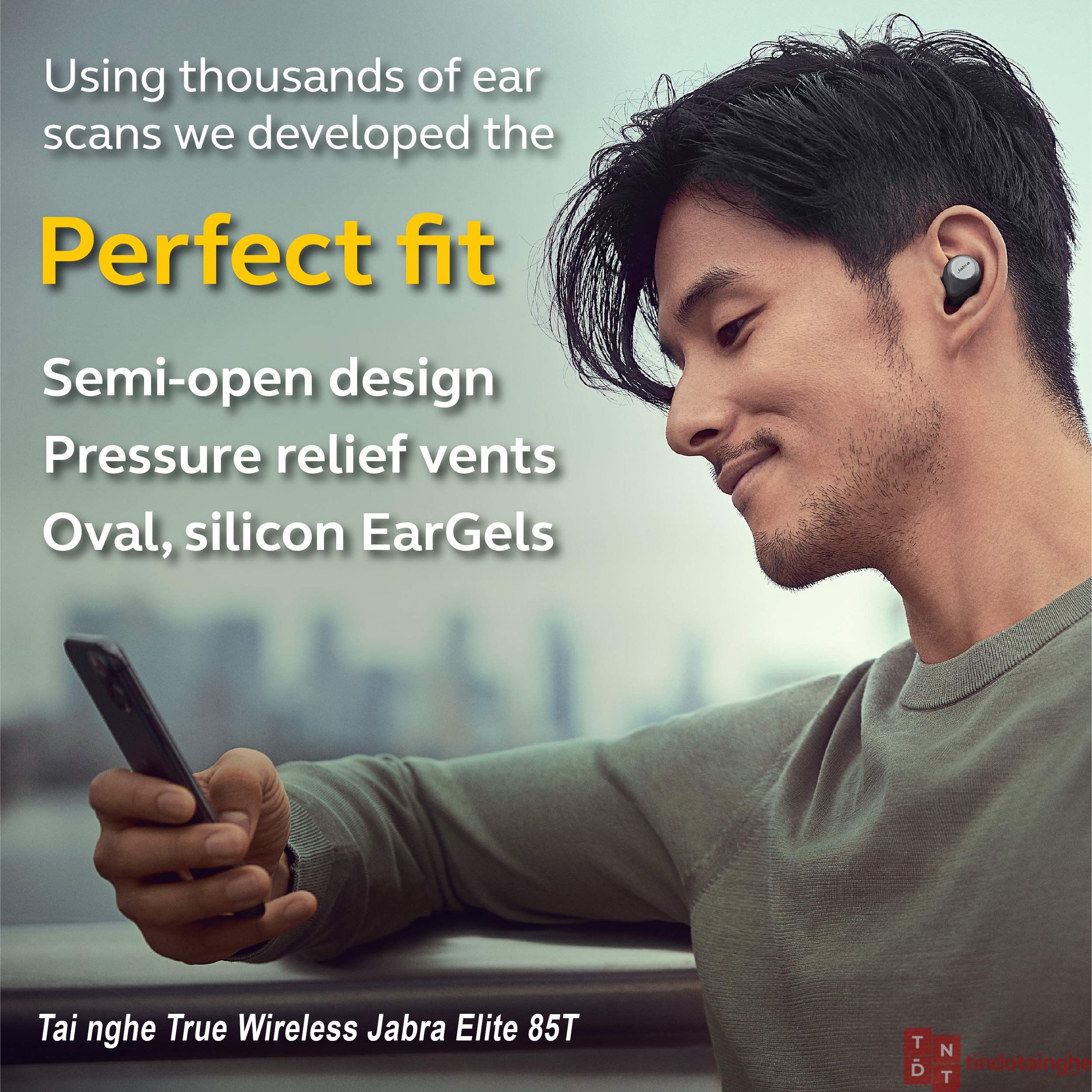 Tai nghe Jabra Elite 85t là một sản phẩm cao cấp của hãng âm thanh Jabra, với thiết kế mới hoàn toàn dạng nửa mở (semi-open) mang lại cảm giác đeo thoải mái như tai nghe Ear-bud nhưng vẫn giữ được khả năng chống ồn như tai nghe In-ear. Với khả năng chống nước IPX4, tai nghe có thể sử dụng ở bất kỳ môi trường nào mà không sợ bị ảnh hưởng bởi nước hay mồ hôi. Tai nghe được thiết kế với trình điều khiển 12mm và đồng thời cung cấp tính năng chống ồn chủ động (ANC) để mang đến trải nghiệm âm thanh tuyệt vời.
